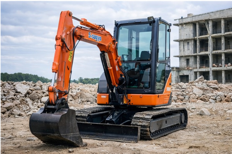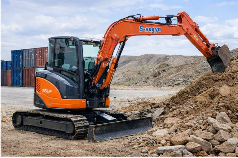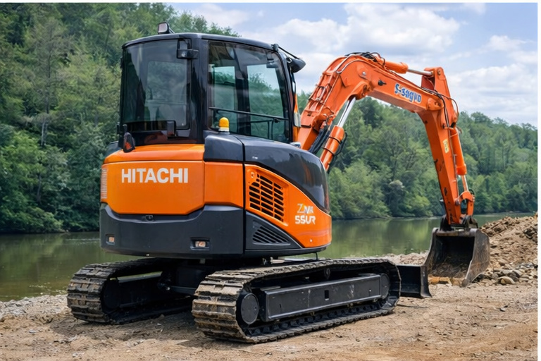 Hitachi EX55UR — компактный мини-экскаватор массой 5,4 т для работ в стеснённых условиях: благоустройство, траншеи под коммуникации, подготовка оснований, точечные земляные работы на частных и городских объектах. Машина оснащается двигателем NSN TD23 мощностью 29,8 кВт — этого достаточно для уверенной работы с ковшом до 0,2 м³ и выполнения типовых задач без «переразмера» техники. Глубина копания до 4,01 м позволяет закрывать большую часть работ по инженерным сетям. Практичная комплектация с поворотной стрелой (Variable Angle Swing Boom) и отвалом упрощает копание вдоль стен и обратную засыпку, а рукоять 1700 мм помогает держать хороший вылет и контролировать точность. Для логистики важны транспортные размеры: около 5,33×2,01×2,62 м и ориентир по перевозочной массе ~4,66 т (может отличаться от эксплуатационной в зависимости от оснащения).
