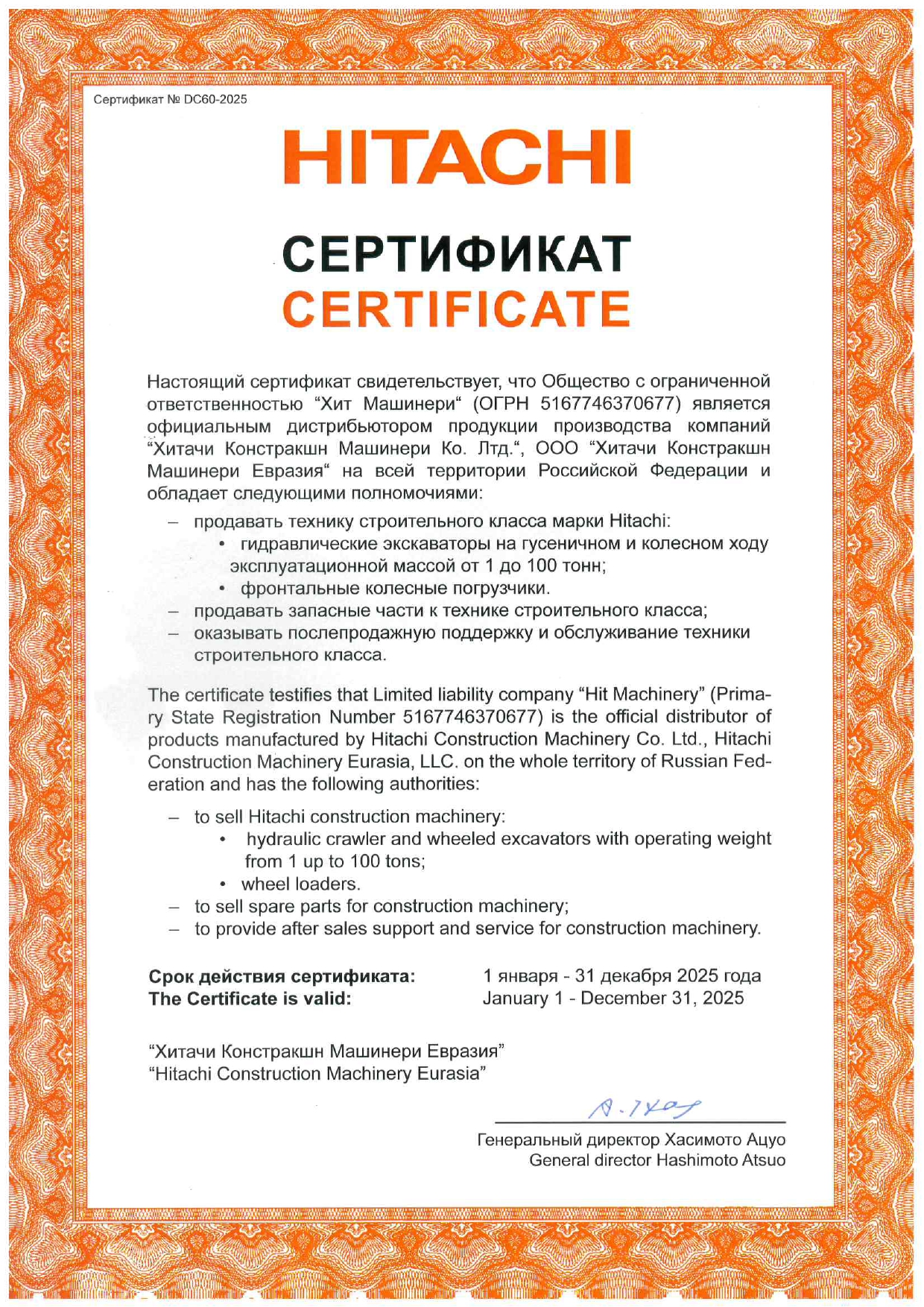 Сертификат ООО Хит Машинери - официальный дистрибьютор HITACHI 2025